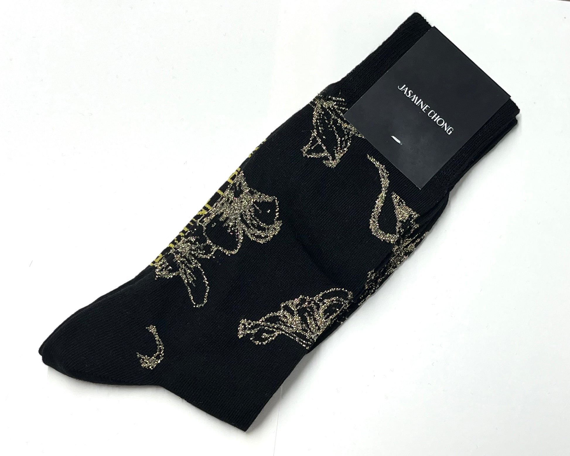 Orchid Gold Socks: A delicate arrangement of tropical orchids for your soles, hand-sketched by the designer and woven in soft mercerized cotton and metallic gold thread, predicted to be the subtly shimmery sock of your dreams. Jasmine Chong logo woven on the sole.