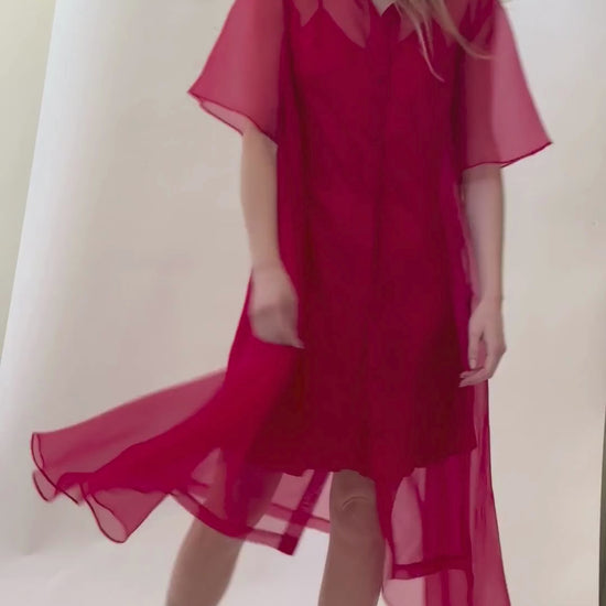 A light-as-air take on our signature silhouette. The Sheer Amie Dress is cut from whisper-thin silk organza, with tapered sleeves, and a diaphanous shape that moves with you. Covered silk-charmeuse buttons. Available in black and crimson. 100% silk organza.