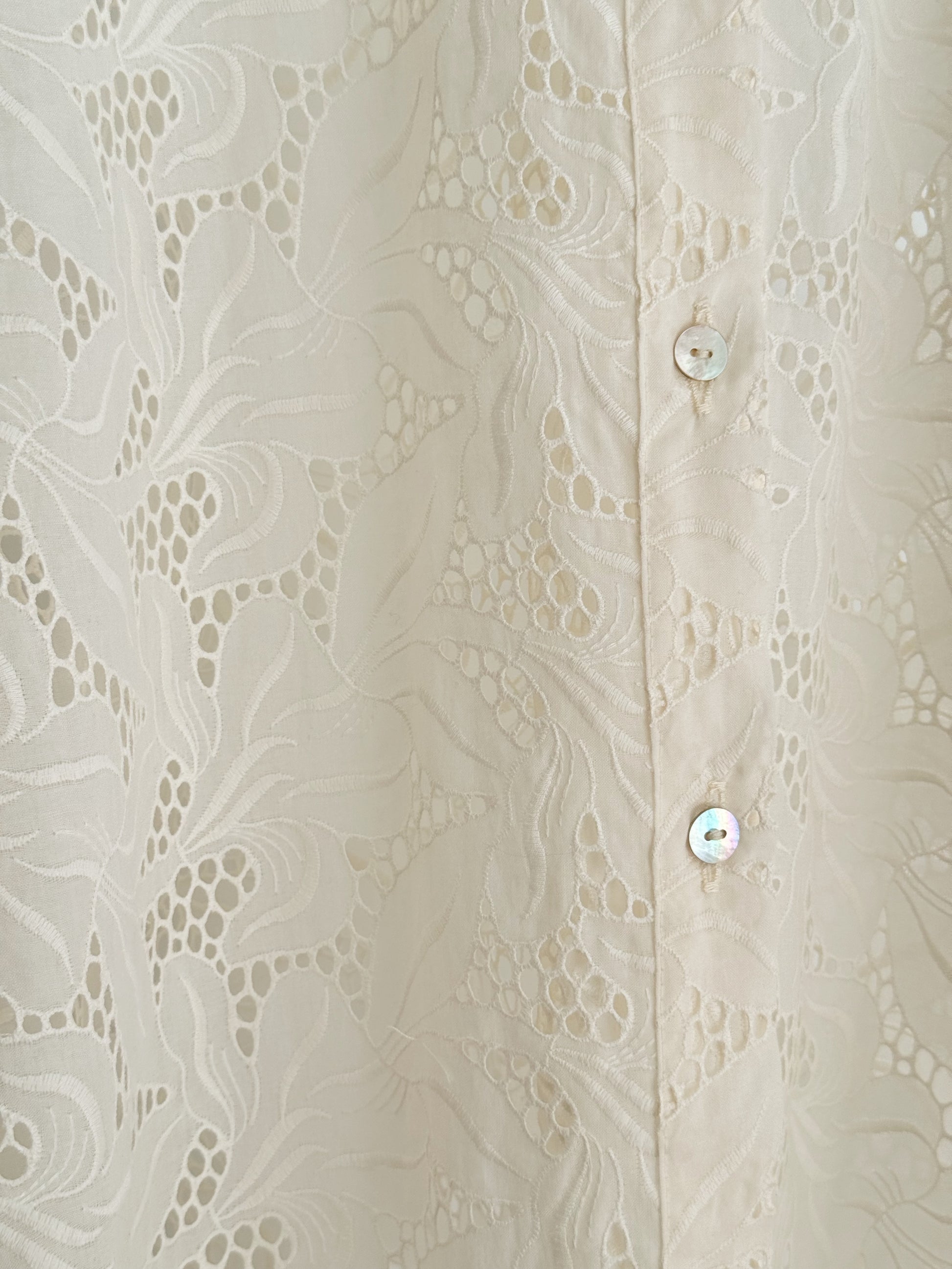 Crafted in intricate broderie anglaise with a freesia floral motif, this sleeveless button-down features a scalloped collar, easy flare through the hem, and gentle swing through the back. Airy volume offers a sense of quiet drama— both everyday and elevated. Wear it with the matching skirt, or style it open over a swimsuit for effortless resort layering. A few favourite details: mother of pearl buttons, charming scalloping at the armhole and hem.